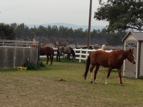 When I decided on what kind of barn I wanted (within out budget), I wanted it placed in out pasture in a way that all we had to do was open the stall doors to let the horse out to pasture, no haltering and no walking so that my mom could put the horses away on nights that I had to work late or during the winter when I didn’t get off until after dark. My horses get fed their breakfast out in the pasture where they spend all day, free to move around, lay down to nap, roll, eat and drink however they want. Four of my horses spend the night in their stalls, so they get the grain and supplements that they require. The mustang get their grain and hay in their stalls, but they are free to come and go as they please because they don’t get anything special to eat.